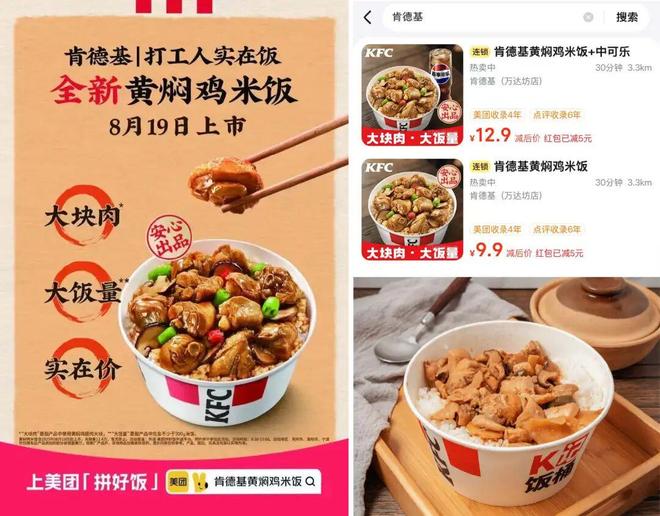事实上,不只有海底捞对“打工人午餐”下手,8月中旬,肯德基在郑州地区,用“拼好饭”平台上新了“黄焖鸡米饭”。从产品图片和网友晒出的实拍来看,把黄焖鸡“盖”在了米饭上,肉饭菜“拌着吃”,本质来看,也是另一种拌饭形式的呈现。
