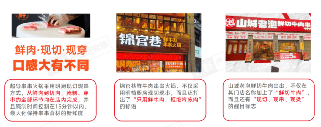 之外,西南地区串串火锅门店占比全国最高,达24.3%。从省级行政区来看,四川、陕西、河南的串串火锅门店数占据了前三。除传统的川渝类串串之外,还有旋转小火锅、砂锅串串、泥锅串串、围炉串串等多种形态。部分品牌为了差异化突围,将“鲜切现串”“现切现穿”作为宣传点,甚至还在品牌名称加上了“鲜切牛肉”“现切牛肉”等字眼来强化这一标签。
