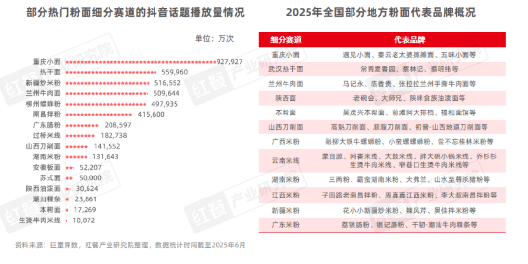 重庆小面、热干面、新疆炒米粉、兰州牛肉面、柳州螺蛳粉、南昌拌粉、广东肠粉、过桥米线、湖南米粉、苏式面、陕西油泼面、潮汕粿条、本帮面、生烫牛肉米线等话题在抖音平台上的播放量均超过了1亿次。