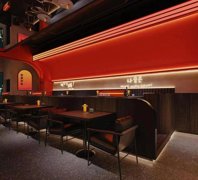 三、日式混搭:传统与现代的碰撞这组日式混搭的装修效果图,则以其独特的设计理念和混搭风格,让人眼前一亮。设计师在保留日式传统元素的基础上,大胆地融入了现代设计元素和异国风情,如工业风的吊灯、复古的留声机和具有异域特色的装饰品等,让整个空间充满了趣味性和艺术性。在色彩搭配上,设计师采用了大胆的对比色和鲜艳的色彩,营造出一种活泼而富有活力的就餐氛围。同时,店内还设置了多处拍照打卡点,如精美的日式灯笼、复古的自行车和独特的墙面装饰等,让食客们在品尝美食的同时,也能享受到拍照的乐趣。四、韩式简约:精致与实用的结合这组韩式简约的装修效果图,则以其精致与实用的结合,赢得了众多食客的青睐。设计师在保留韩式传统元素的基础上,采用了简洁的线条和明亮的色彩,营造出一种简约而优雅的就餐环境。同时,店内还布置了韩式传统图案的餐具、桌布和装饰品,让人在品尝美食的同时,也能感受到浓厚的韩国文化氛围。