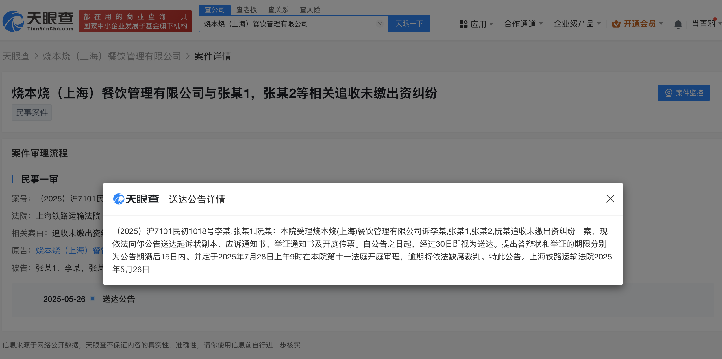 近期,上海铁路运输法院发布了一则关于烧本烧(上海)餐饮管理有限公司与其前股东张翰之间未缴出资纠纷案件的公告。公告中明确提到,法院已向张翰等人送达了案件起诉状副本及应诉通知书,送达自公告发布之日起30日后生效,并定于2025年7月28日正式开庭审理。