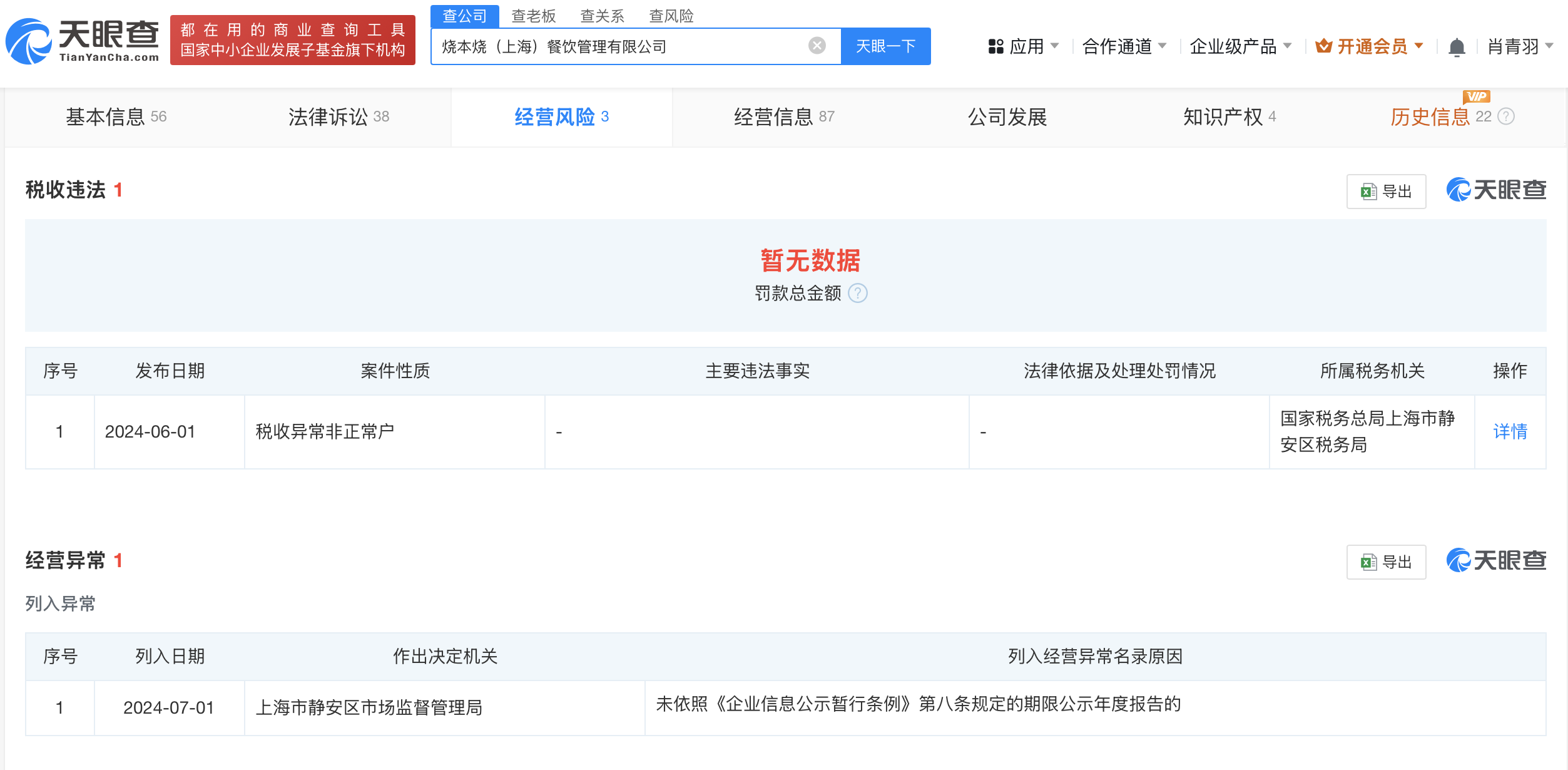 烧本烧公司已面临多重风险。据公开信息,该公司已关联到一起破产案件,申请人为南京众天下餐饮管理有限公司,该案件由上海市第三中级人民法院经办,公开日期为2024年6月。不仅如此,烧本烧公司还因税务问题被国家税务总局上海市静安区税务局列为非正常户,并在2024年7月被上海市静安区市场监督管理局列入经营异常名录。